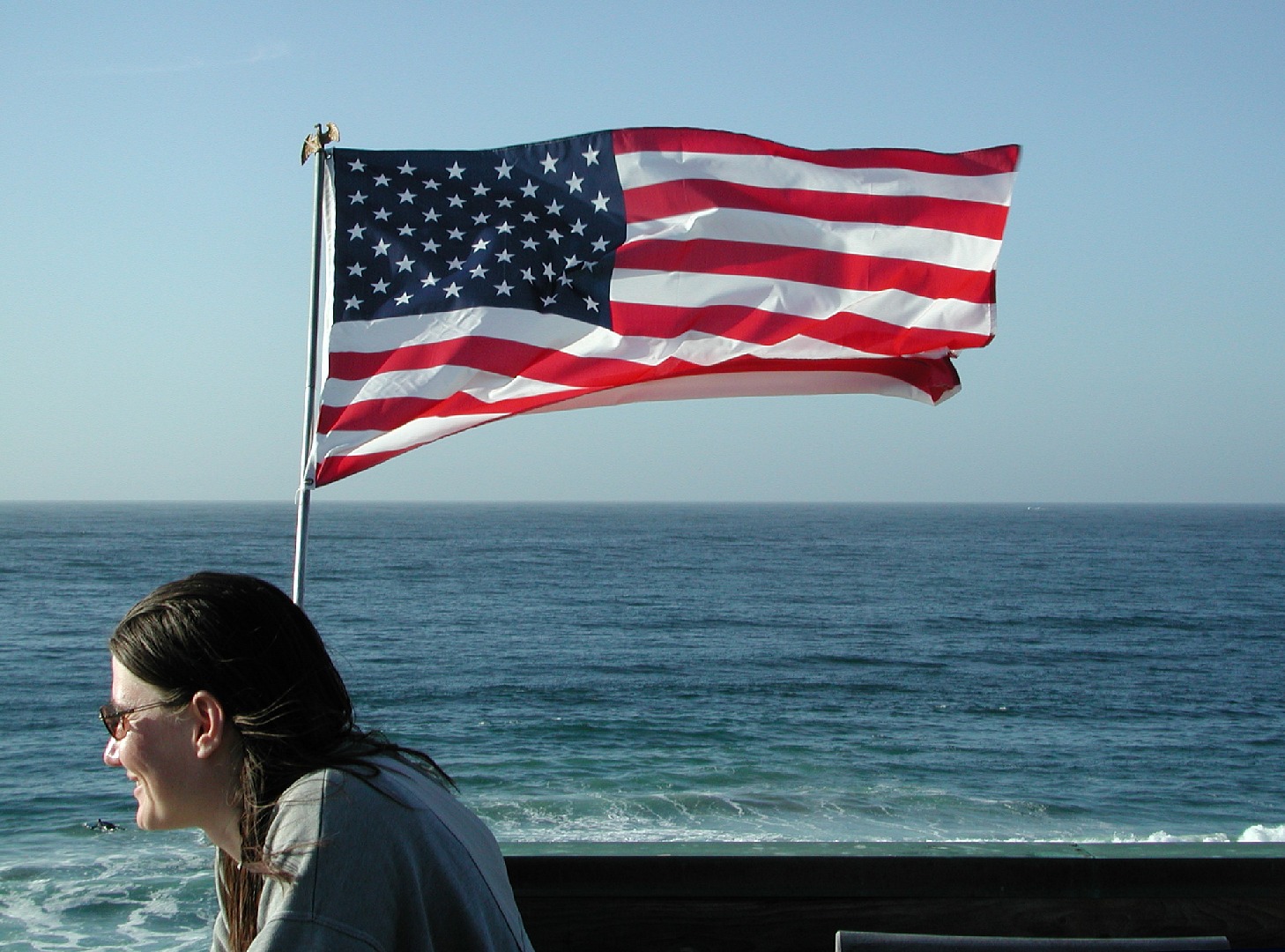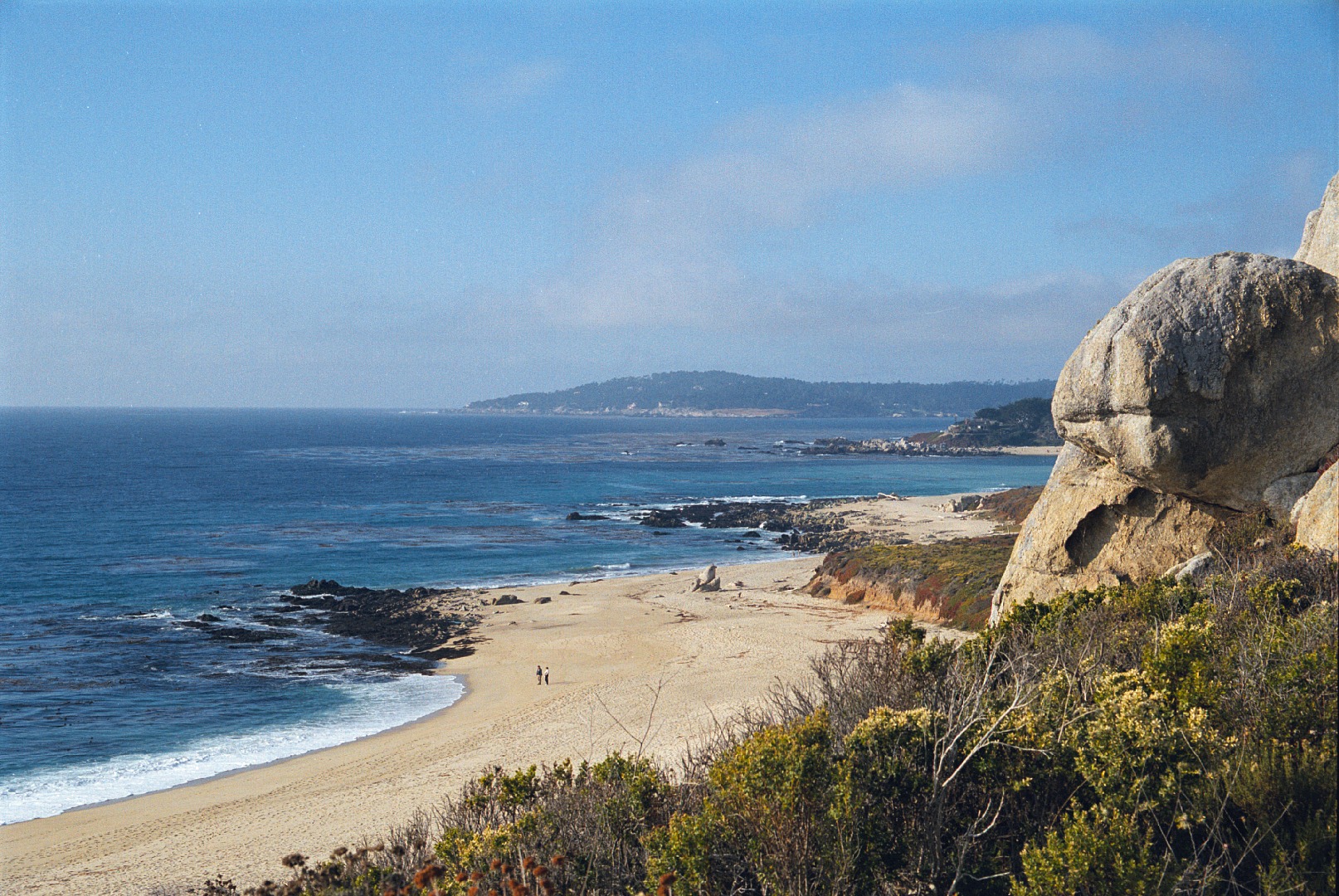 However, the coast is beautiful, and — thanks to the low temperatures — you don't have to push through a crowd of red bellies, nobody yells at you selling icecream or similar beach treats, and you're safe from crying children (at the density of two younglings per two miles of beach, these creatures appear cute and lovable). Near CARMEL (Steinbeck again), we visited a rocky and sandy beach with a "natural chapel" — a large towering rock — where weddings take place. None was happening then; instead, a small, somewhat drifty-looking man was, posing with an electric guitar for a photographer. The drifty artist smiled sweetly at Sid and the photographer said bitterly "... they probably don't know who you are." We hurried by, to avoid bursting into laughter right in their faces. The photographer looked ready to drown our offence against his friend's in blood. A little way down I made Sid kiss me passionately. It might not have been very nice from me, but I have to admit that I did not like the (no doubt famous) artist's slobbery look a single bit — I felt the need to indicate that Sid was already taken.