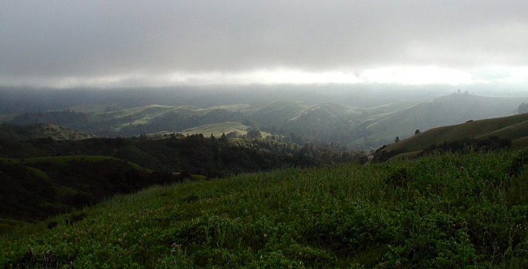 I refused to endure driving back with my teeth clenched, so we went around the worst hills on somewhat wider and less winding road. An interesting weather pattern developed near the hilltops -- clouds and fog were rolling in from the ocean, with portions of them sneaking right along the curved landscape. Yet the Valley below was surprisingly clear, lacking its usual smoggy lid.