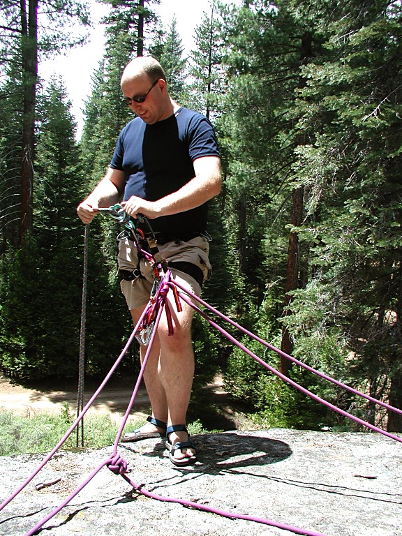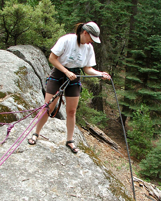Sid never had the honor with a "living rock", and had expressed a wish to at least learn how to rappel. So I tied my ropes between two mighty pines (to make sure it would hold up to Hippo's weight) and we practiced there for a while.