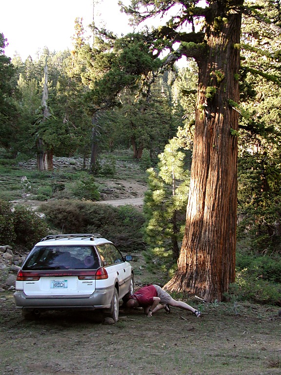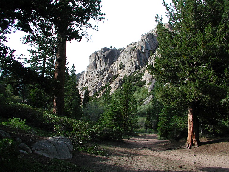 On Sunday morning we were so tired that we canceled our plans to conquer Sonora Peak. Slowly staggering around the tent, we tried to come up with a programme that would all take place in a colder climate and demand only minuscule physical effort. Eventually we drove off aimlessly and took the first interesting road off 108, going into a valley to some creek. We zigzagged on a dusty road among mid-sized boulders, until we found a larger one, well accessible, with sold looking trees on top.