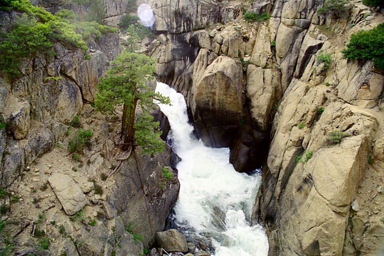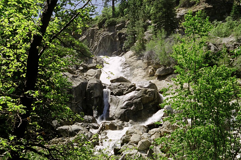 We also discovered in the morning that a roar we attributed to trains or some other industrial activity, which lasted through the whole night, did actually come from a waterfall deep in the valley under our hill. It seemed to be worth closer scrutiny, though it was actually an overflow runoff from Pinecrest Lake. We left our tent and sleeping bags and drove down.