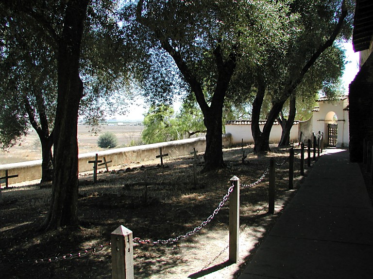 But beware the illusion of tranquility -- San Andreas Fault runs right at the foot of a hill that holds the cemetery. A strong earthquake of 1906 damaged the church walls, and they were not repaired until 1976.