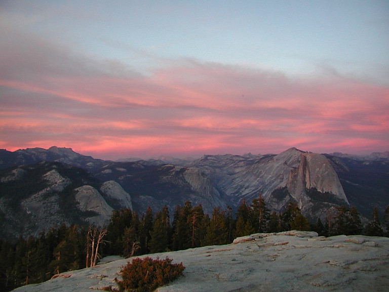 To make sure this good deed got noticed, we took Vlasta all the way to Glacier Point -- about thirty miles of switchback road from Yosemite Valley, up a terrible slope (ascending approx. 3,000 feet). The very lookout was heavily populated, so we backed off a bit, Vlasta began to pack his bags and stuff from our car. We wished him bon voyage and -- being full of energy -- hiked up the nearest hill (just to see what was behind the horizon). And back we ran, for better boots. We saw a rocky loaf in a distance that beckoned to be conquered, but it did not seem a good idea to do it wearing sandals. A glance at a watch made us take a flashlight along, for sunset was approaching and we estimated the hike to take about an hour.