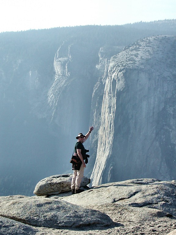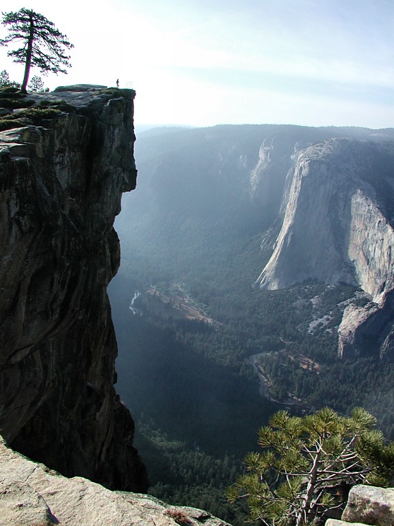 | The little ant near the edge to the left is my mom, Yosemite Valley in the middle, El Capitan to the right, from a side - why do they call this edge "The Nose"? |