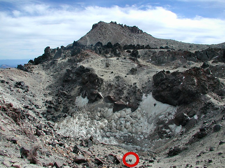 | A crater inside Lassen Peak - for scale, notice two sitting tourists indicated in the larger picture (click). |
