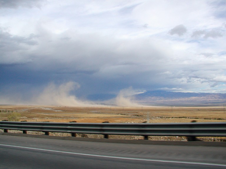 | No, this is not weather for driving into a wasteland on dirt roads (soon to turn muddy or outright flooded). The sun is still shining, but you can see first drops on the lens. |