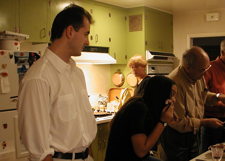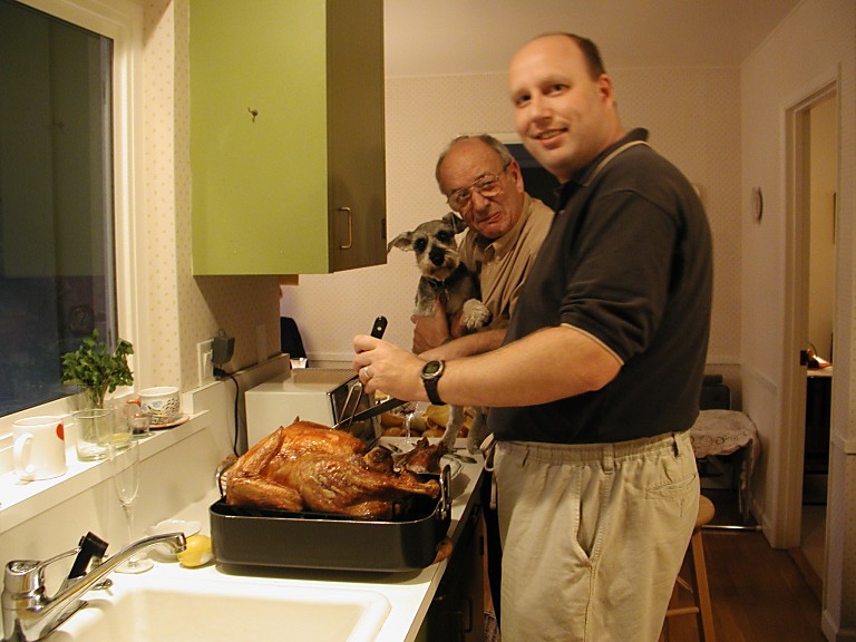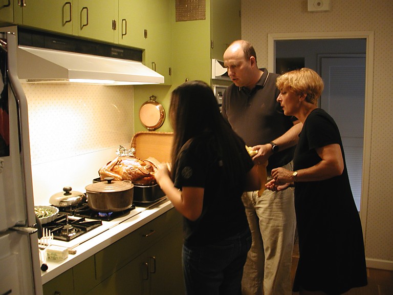 Also strong was this year's team -- only Kren's there were five to be counted (six including Smudla); beside George, Martina, and Madeleine, there was George's brother Petr with his wife, Zuzka. "Adopted orphans" were three, that is, Tomas, Sid, and I. Our celebration ran along well established rules -- guests were lullabied by several glasses of wine, later the whole company moved into the kitchen, where the main part took place -- cutting up a turkey. A big roast can tire several mighty men, and the others check the quality of the work right on the spot. Madeleine, for example, did not leave her strategically located place on a barstool next to the turkey and frequently "sampled".