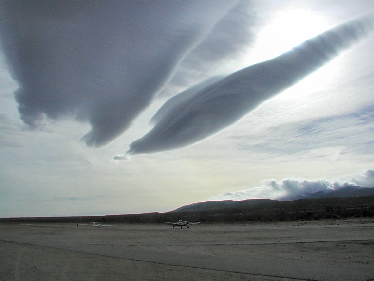 Our experience and extortion of the previous day turned us into two grumbling zombies, but we were still not giving up. When Sid glimpsed a sign on the side of the road announcing sightseeing glider flights, we gladly turned in the direction given. At Great Western Soaring School, they offered us flights within fifteen to thirty minutes, and we went to watch the little planes. Funny clouds rolled in the sky, Dawn, a pilot of the tow plane, described dreamily how beautiful it is up there. Alas, a cross wind was picking up strength, and soon even a layman that I am became clear that its direction of right angle to the only runway is not the best thing. During the next takeoff, both the tow plane and the towed glider were swept to the side by a strong gust, and the tow plane began to swerve dangerously, few feet above ground. Glider disconnected and sadly dropped back to the desert, tow plane recovered and disappeared in the clouds. Sand and small rocks flew through the air now, gliders on the ground needed crew to stay inside and several more people to hold their wings, lest they would turn over. Once the gliders were secured, Dawn landed with her tow plane, and that one, too, was fastened securely to the ground. It became clear that a) we won't see Joshua Tree, b) we won't find accommodation, and c) we won't be flying.