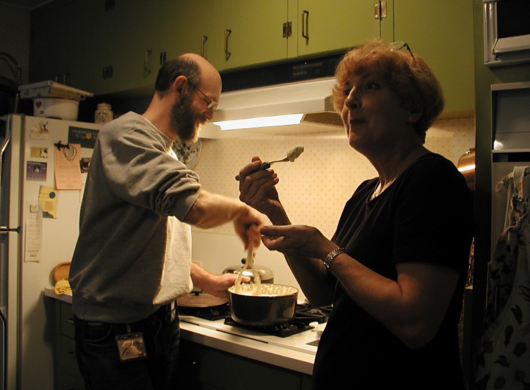 | Christmas Day crew alternated from Thanksgiving assignments - Martin toils at mashed potatoes instead of Tomas, under a close scrutiny of our host. |