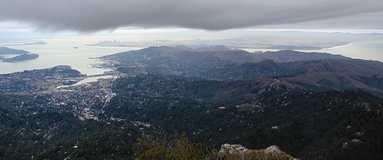On a weekend around December 15, I got slightly nervous because of approaching Christmas, but I did not give in to any madness, quite to the contrary. We went on a really easy trip with Sid to Mt. Tama (the poor mountain has a real name: Mt. Tamalpais, but nobody can say that with certainty to be correct, hence the short version). Tama is only a little bit north of San Francisco, behind the Golden Gate. From it, one can see (provided you managed to hit one of about five days of a year with SF out of fog) down town San Francisco, Bay Bridge, Oakland, lots of the peninsula, Pacifica, and a big chunk of the Bay -- as far as your eyes can, and smog allows to, see. The whole area of Mt. Tama consists of multiple parks and preserves. No private property, small parking lots everywhere, and tourist trails. Each of them seemed to be the last and highest located one, but Sid kept telling me that this "wasn't it" yet, and that we must drive higher. So we drove on and on, until the road ended -- at a hot-dog stand. There, we had to leave the warm and cozy environment of our wagon, put on several layers with a windbreaker on top, and a wooly hat, and immerse ourselves into a cloud with a vision of a peak somewhere there.