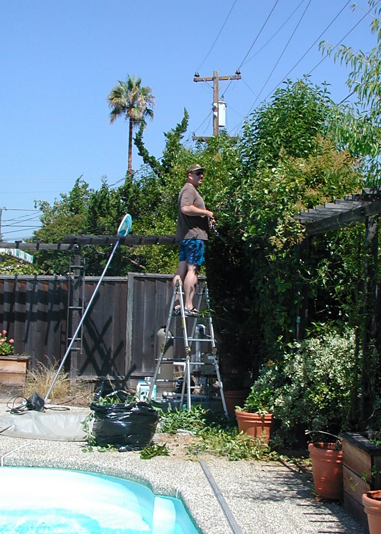 Hippo is also quite effective on any destructive activity. In May, we carefully trimmed all overblown roses, one twig at a time, just not to "cut them too much". Today, they're six feet tall and we bought large hedge trimmer for my Hippo. With their help, he wedged a path through "trees" blocking access to our pool machinery, and surprisingly avoided cutting any of many wires hanging above our fence. He sometimes has to pacify yew-trees that threaten to lift our roof off.