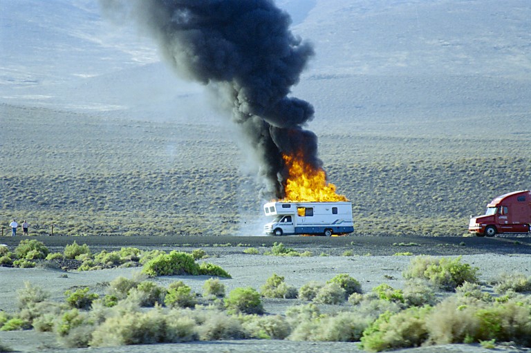 Refreshed, we continued through the desert across Carlin, NV. It was, unlike its recently flooded Prague namesake, quite dry there. A while later, smoke appeared on a horizon, we were expecting one of many wild fires that regularly plague western summers. Coming closer, we found a motorhome on fire. I don't know what may be the reason, but I get to see many more burning cars than I used to in Europe. As if they combusted spontaneously -- they're often not involved in any accident. This motorhome, too, was quietly parked on a shoulder and burned. Gawkers and other connoisseurs were generously represented, so we continued on without stopping, on to Elko, NV, where we found our lodging at a motel. Hippo had to suffer through the first of our many American food dinners to come (a choice of hamburger or steak).