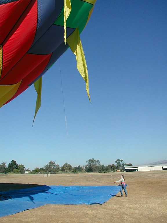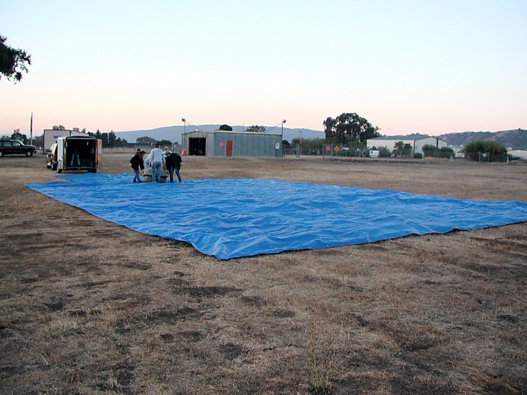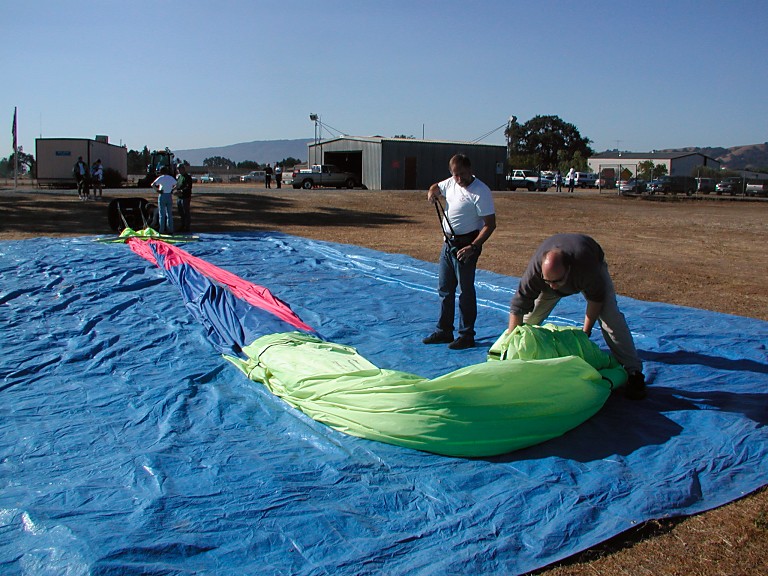 First, a huge tarpaulin must be spread on a level ground, to protect a fine fabric of balloon's