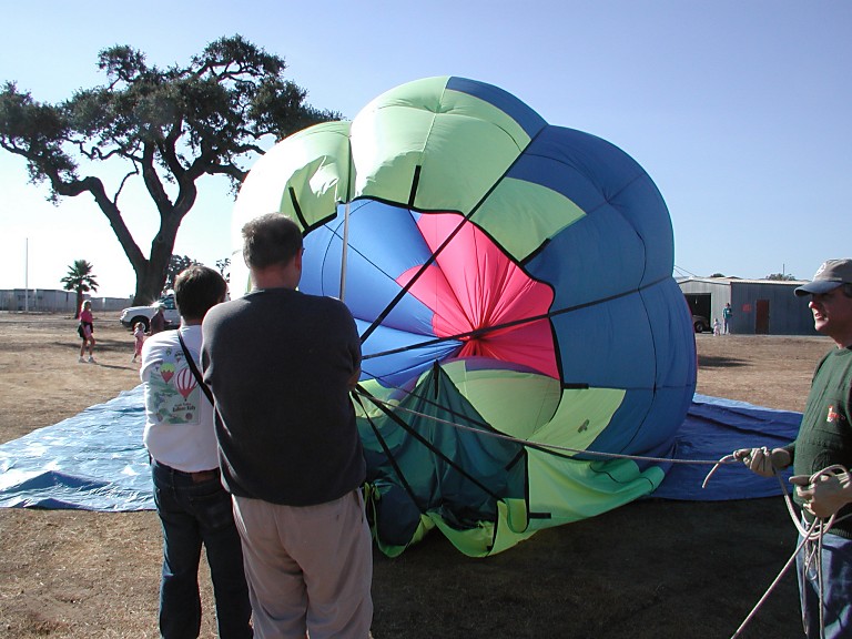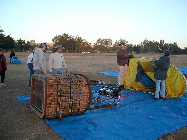 We carried out and assembled the basket, Brent tested burners. Then we unwrapped the actual balloon (a big bag), attached it to the basket and began to fill it with a cold air, using a small gas engine propeller fan. It surprised me that this (cold air) inflates the envelope to a practically full shape. Finally, one has to heat it up a little with a burner, and it's done. Clients hopped in, we took their picture, wished them pleasant flight, and turned around to see how Dana, who did not have any clients, managed to proceed with his balloon.