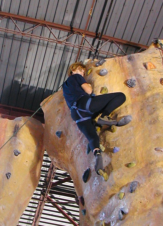 Did it occur to you that visiting us had to be somewhat taxing? Consider a lengthy lecture on local characters and details of refraction telescopes in English, a car boiling its cooler in a desolate desert, coming to edges of abysses, walking her along chained paths during a mountain thunderstorm, raw fish to eat, toiling around our house, and eventually abandonment in Monterey. Combine that with our household based on semi-permanent heaps of stuff. Does it seem to you that we could not pile any more insult on injury? Well, think again. We had one more torture ready -- a wall. A climbing wall in our gym.