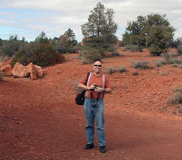 | Hrochovo vyrudlé triko báječně splývalo se sedonskou červenicí -- tak teď už vím, proč ho rád nosí: je to pouštní maskáč. |