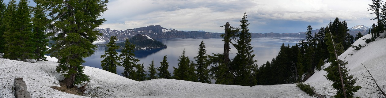Crater Lake bylo ještě pod sněhem, i okružní silnice ještě neotevřeli. I tak to bylo moc pěkné, hlavně při představě, že před hodinou