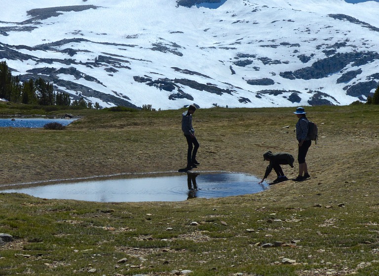 Výstup ale stál za to, ocitli jsme se v mělké pánvi s modrým jezerem a tůňkami z tajícího sněhu.