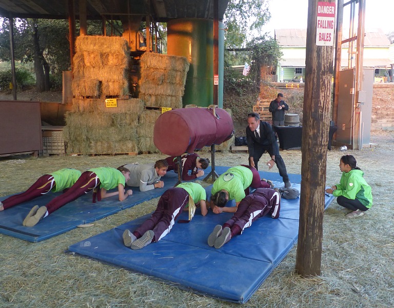 skutečně ve vzduchu, na vrcholu lidské pyramidy — a to celé na běžícím