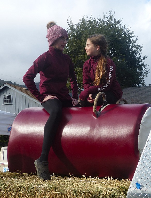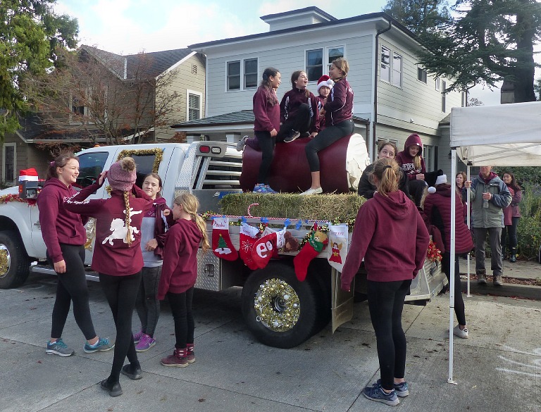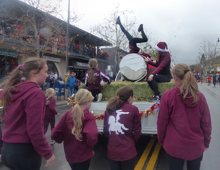 První prosincovou sobotu se taky koná tradiční vánoční průvod v Los Gatos. Několik let jsme chodívali s Bear Creek Stables, teď už třetí rok chodíme s Lisinou voltiží — Mt. Eden Vaulting Club. A tak jako loni, i letos vypadala předpověď špatně. Já jsem měla nápady typu jako jestli to nezrušit, když má pršet, ale Lisa mi věnovala naprosto zhnusený pubertální pohled (takový ten, že naprosto nechápe, jak tak geniální dítě může mít tak naprosto nemožné rodiče) — a tak jsme šly. Jen my dvě; Sid se účastnil ve funkci taxikáře — vyklopil nás ve městě (v němž se nedá zaparkovat) a o čtyři hodiny později nás nabral na druhém konci města, za koncem průvodu.