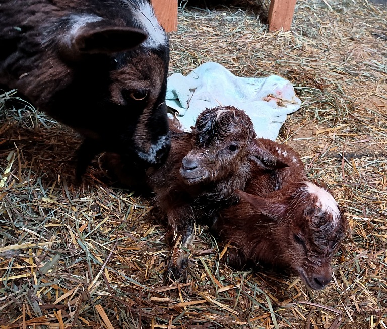 Během zhruba deseti minut se narodilo druhé kůzlátko, to už vyplulo na svět